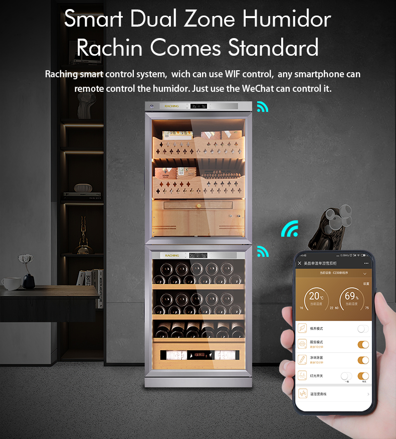 Die Zigarrenzone ist als eigenständiges Pflegesystem ausgelegt und nutzt PID‑gesteuerte, autonome Frequenzumwandlung, eine Multi‑Core‑Konfiguration und WLAN‑basierte Steuerung.Mehrkernkonfiguration und WLAN-basierte Steuerungen verwendet. Es gibt keine grobe Aktivierung oder Deaktivierung der Temperatur und Luftfeuchtigkeit mit PID-Steuerung, keine grobe Abstimmung, sondern feine Anpassungen. Das Vorhandensein und/oder Fehlen feiner Abweichungen wird schnell erkannt und leicht angepasst, was Schwankungen reduziert und Spannungsrisse in den Deckblättern minimiert.